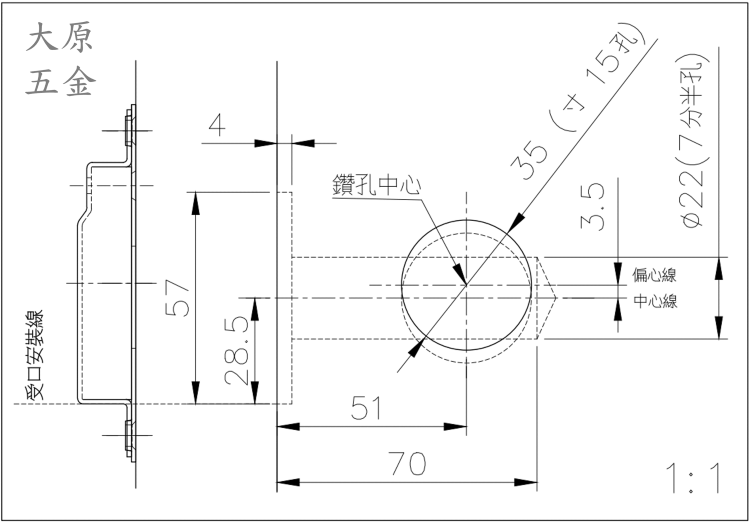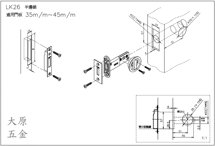 • 產品造型為圓型呈現,僅單邊具有可上鎖之功能,而門片另一側正常無施工,以崁入方式施工,主要用於和室暗拉門以平行拉關勾上門框的方式鎖合